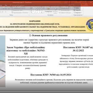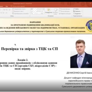 Навчання проводилося з 09 лютого по 06 березня на базі Центру розвитку кадрового потенціалу СумДУ та було спрямоване на професійний розвиток і підвищення компетентностей фахівців, відповідальних за організацію та ведення персонального (персонально-первинного) військового обліку. Програма охоплювала ключові питання організації та ведення військового обліку, оформлення бронювання військовозобов’язаних, аналізу військово-облікових даних та забезпечення взаємодії з Територіальними центрами комплектування та соціальної підтримки.